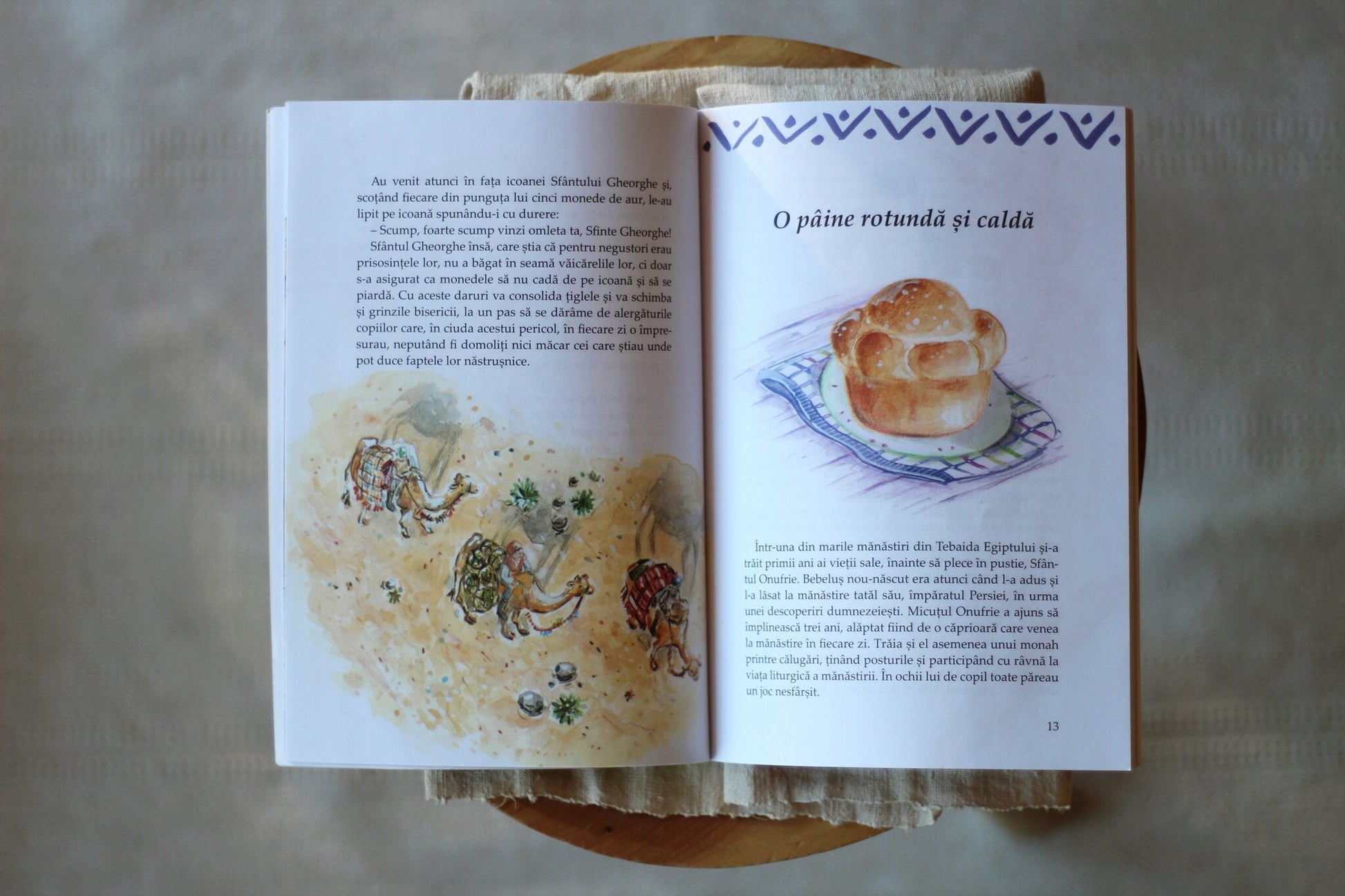 Cam așa e în cazul acestui minunat volum de istorioare cu tâlc: e îmbucurător pentru întreaga familie! Oare cei mari nu vor zâmbi aflând cât de scump își vinde Sfântul Gheorghe omleta? Sau când îl vor vedea pe micuțul Onufrie căznindu-se să care pâinea uriașă dăruită de Hristos? Sau văzând disperarea de pe fața hoților care, intrând la Sfântul Arsenie Capadocianul în chilie, la plecare n-au mai găsit ușa? Nu vor fi și ei uimiți peste măsură, asemenea copilașului care l-a văzut pe Sfântul Evmenie zburând în momentul ieșirii cu Sfintele Daruri?